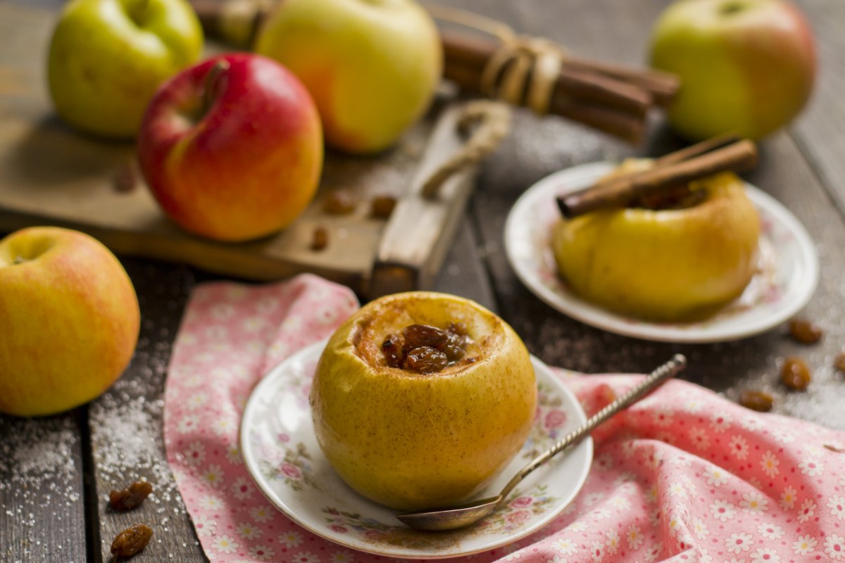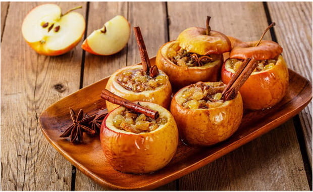 Ингредиенты: кисло-сладкие яблоки (6 шт.), изюм (3 ст. л.), грецкие орехи (12-15 шт.), мед (6 ст. л.), корица (0,5 ч. л.).