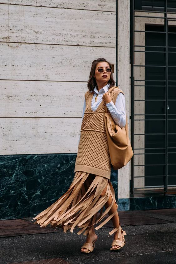 Не стоит забывать весной и летом 2023 года и о летящей бахроме - эта отделка по-прежнему в моде. В тренде будут как платья полностью состоящие из ярусов тонких нитей или наряды, декорированные бахромой.