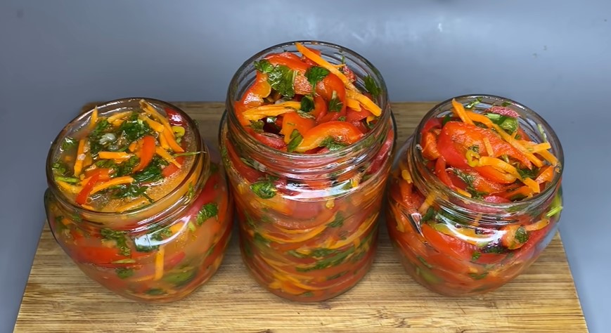 После истечения указанного времени салат перекладываем в чистые банки, плотно его при этом утрамбовывая. Сверху добавляем маринад, в котором мариновался перец и остальные компоненты.