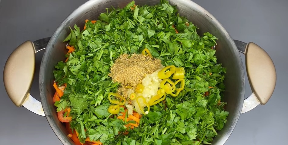 Приготовление: перец нарежьте полосками, морковь натрите на терку, петрушку измельчите. В отдельной емкости соедините перец, морковь и петрушку. К ним добавьте измельченный чеснок и острый перец, который предварительно нужно нарезать колечками. Последние два компоненты не являются обязательными, их можно добавлять по вкусу.
