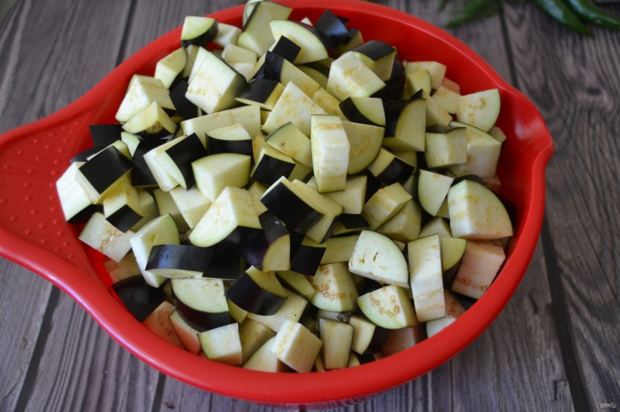 Баклажаны промываем, по желанию - очищаем от кожуры. Затем нарезаем средним кубиком. Готовим раствор – в 1 л воды растворяем 1 ст. л. соли. Опускаем в него нарезанные овощи примерно на час.