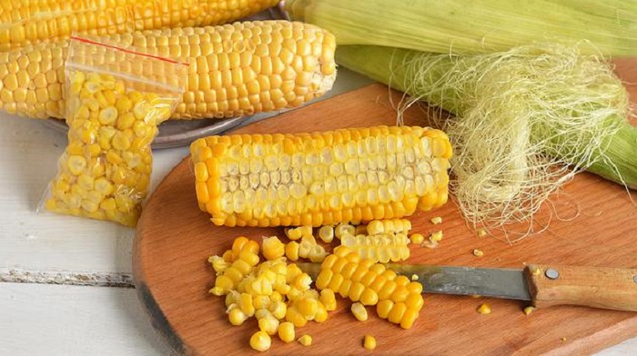 Затем берем острый нож и срезаем зерна, складываем их в специальный пакет и отправляем в морозильную камеру. После разморозки варить такую кукурузу не нужно, достаточно опустить в кипящую воду на несколько минут.