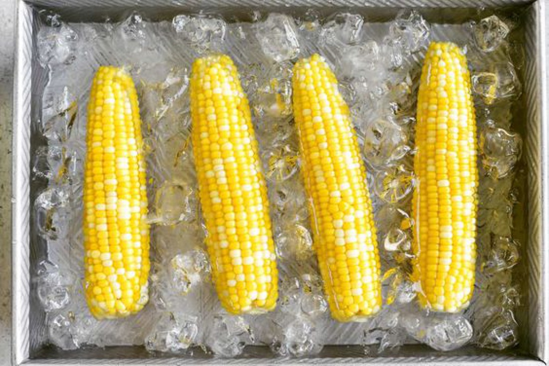 Берем большую миску и наливаем в нее холодную воду, добавляем в нее лед. Отваренную кукурузу выкладываем в ледяную воду на несколько минут, затем вынимаем на бумажные полотенца.