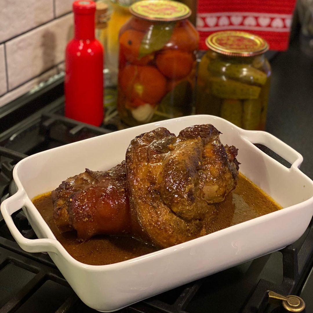 Форму с рулькой ставим в горячую духовку и выпекаем 2-2,5 часа. Через каждые 15-20 минутнеобходимо поливать ее соусом, в котором она запекается. Достаем рульку и ждем, пока она остынет.