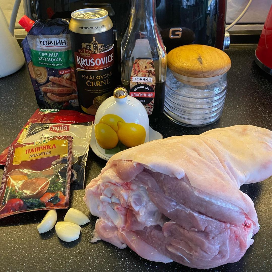 Ингредиенты: рулька (1 шт., примерно 1,5 кг), чеснок (2-3 зуб.), соль, перец, специи для свинины, паприка, темное пиво (500 мл), горчица (1 ст. л.), соевый соус (2 ст. л.), сок лимона (1/2 шт.).