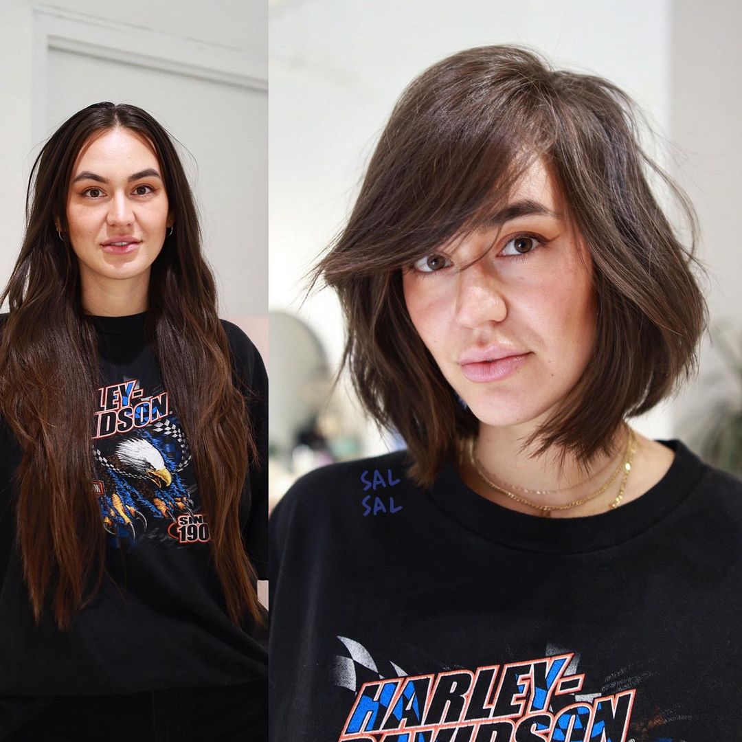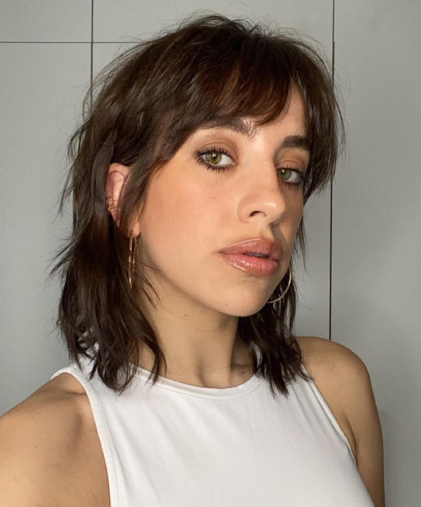 Трендовая стрижка шегги, которая характеризуется текстурированными "рваными" прядями, также хорошо смотрится с косой челкой.