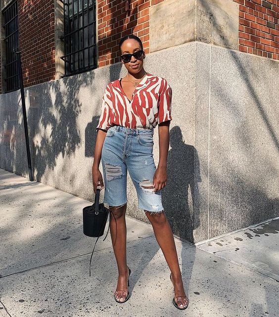 Джинсовые шорты – классический и универсальный выбор на лето. В 2023 году популярностью у модниц пользуются бермуды - удлиненные джинсовые шорты с нотками нарочитой небрежностью. Вы можете самостоятельно обрезать старые джинсы, либо выбрать модели с рваным краем, потертостями. Также актуальны широкие и расклешенные к низу бермуды.