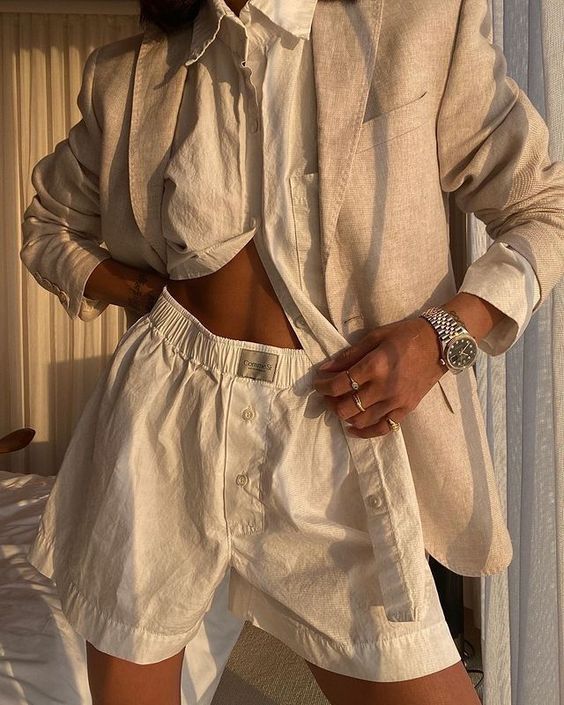 Мир привык, что боксеры - нижнее белье для мужчин. Однако в 2023 году модницы сделали их элементом уличной моды, и сегодня многие фешн-блогеры создают с боксерами интересные летние образы. Сочетайте их с рубашками в тон, майками или футболками оверсайз.