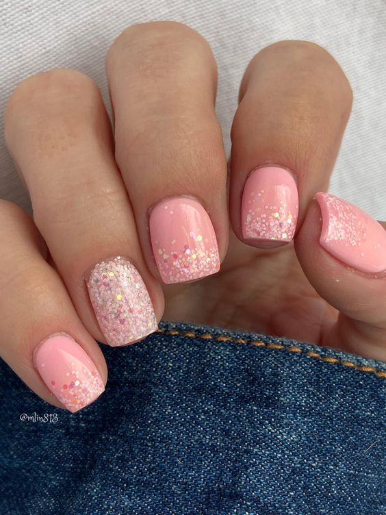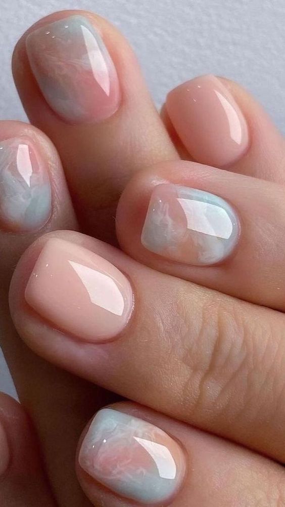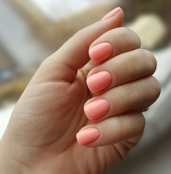 Также на весну можно присмотреть нежный персиковый маникюр. Дополните однотонное покрытие втиркой, чтобы получить трендовые глазированные ногти или, как их еще называют, "глазированный пончик". Еще один вариант дизайна – сверху покрываем их блестками.