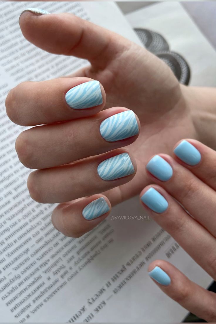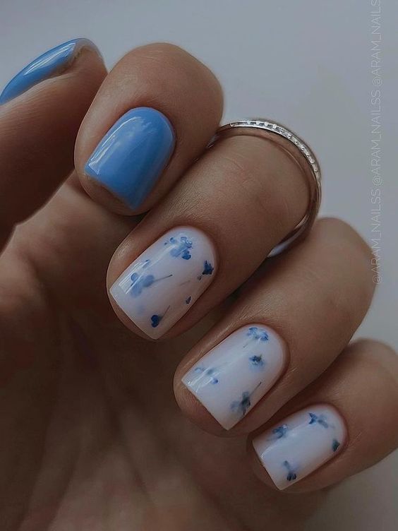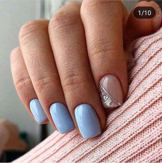 Также в тренде весной будет голубой маникюр. Можно выбрать светлый оттенок гель-лака, который будет напоминать ясное небо или морскую лазурь. Дополните такой дизайн стемпингом на всех ногтях или же выделите один ноготь с помощью геометрической линии и фольги. Еще один вариант – украсьте ногти цветочным узором.