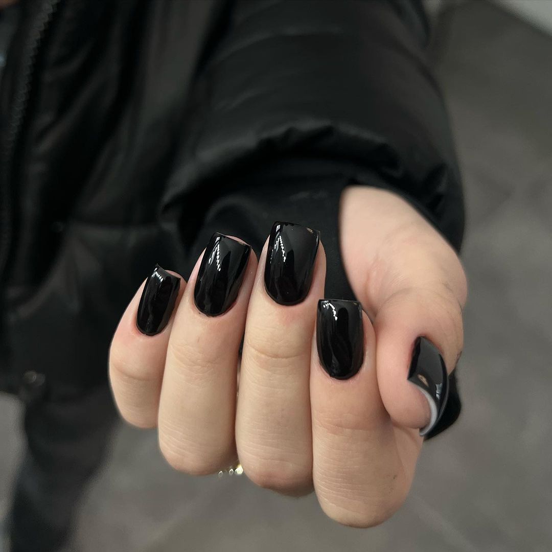 Мода на матовый маникюр несколько отошла в 2024 году: в фаворе глянцевый блеск и холодное хромовое сияние. Изысканно и стильно на ногтях любой длины будет смотреться черный маникюр с блестящим топовым покрытием.