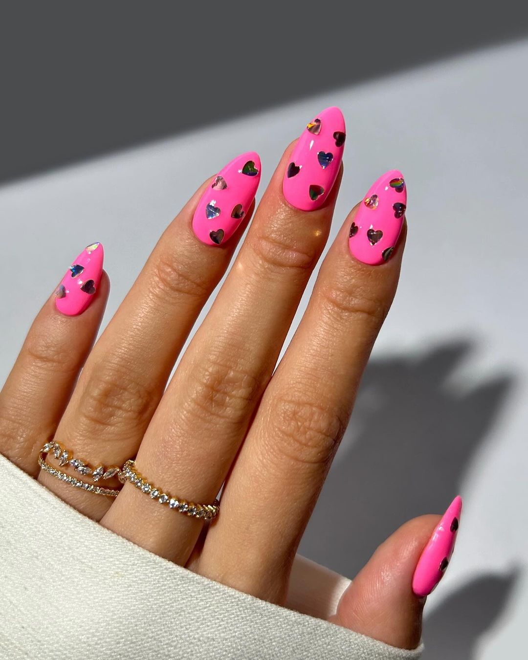 Этот неоново-розовый ослепит его обладательницу и без дизайна, а россыпь серебристых сердечек на всех ногтях сделает этот маникюр по-настоящему праздничным. Такой дизайн станет отличным выбором для тематической вечеринки ко Дню влюбленных.