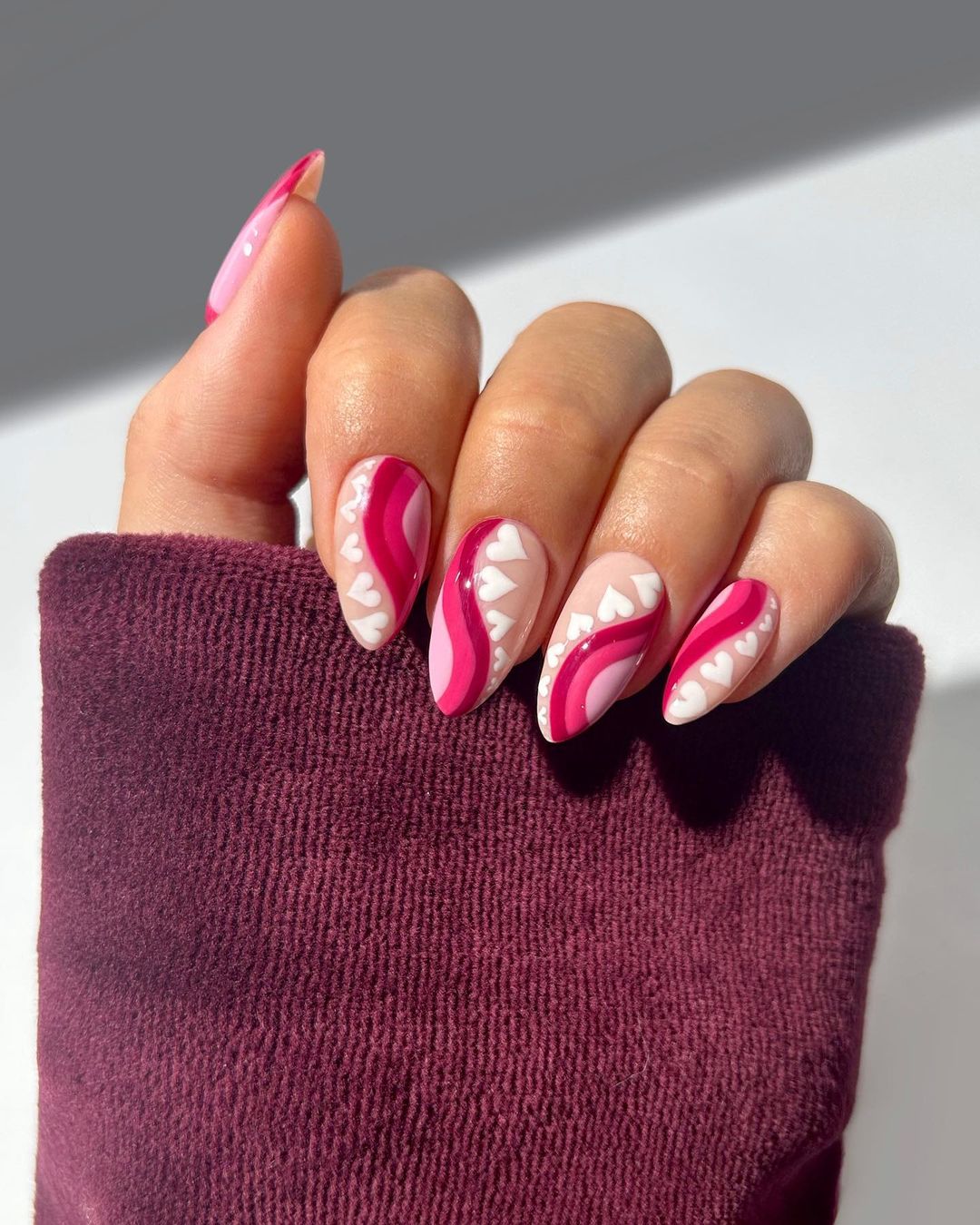Если вы поклонница замысловатых дизайнов, тогда вам может понравиться этот вариант - с волнистыми линиями разных оттенков розового и белых сердечек, которые красиво располагаются вдоль ногтя.