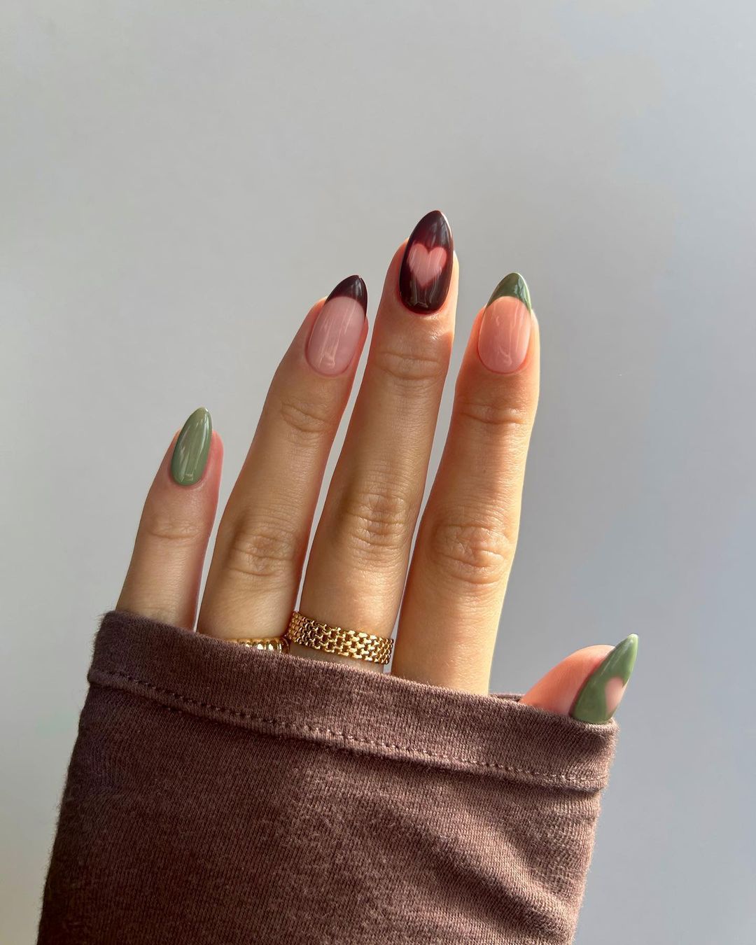 Если хотите отойти от розового, тогда присмотритесь к этому дизайну. Он выполняется в спокойных оттенках, таких как коричневый и оливковый, с прозрачными сердцами на среднем и больших ногтях.