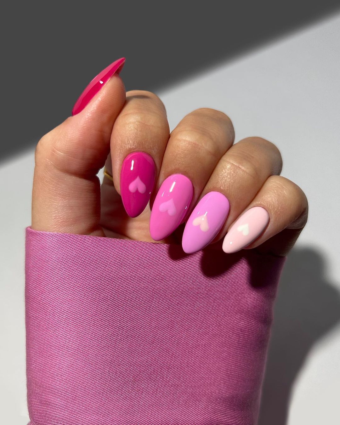 Это вариант для тех, кто не может определиться с оттенком розового. Покройте каждый ноготь разным лаком из розовой палитры и украсьте оттеняющими сердечками. Расположите их по центру.