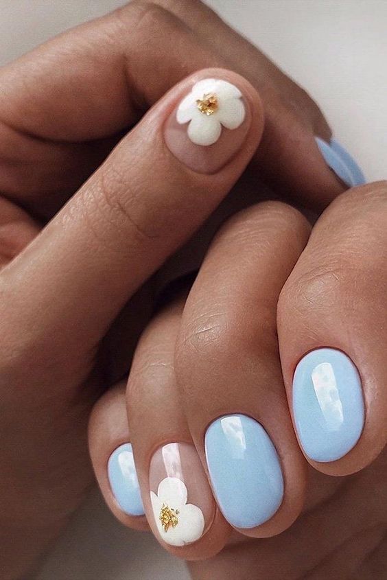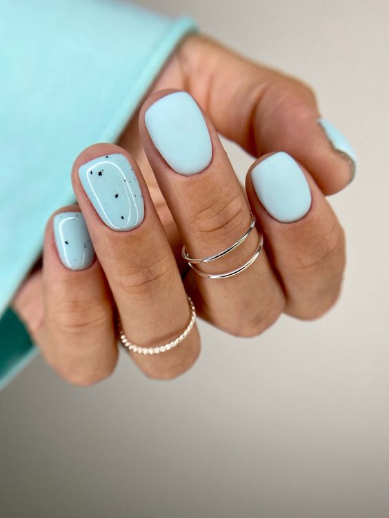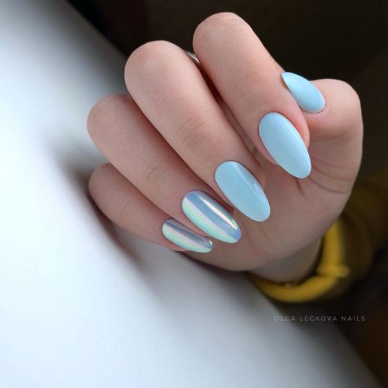Голубой маникюр уже называют одним из главных трендов весны 2024 года. Выбирайте светлый оттенок гель-лака, который будет напоминать ясное небо или морскую лазурь. Такой нейл-арт будет красиво смотреться на ногтях любой длины и формы, а дополнить его можно цветочными элементами, втиркой или дизайном перепелиное яйцо.