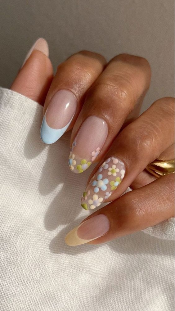 На длинных ногтях можно сделать французский маникюр с цветами, например, ромашками. Или же придумать необычный дизайн с мазками разного оттенка и дополнить его узорами цветов.