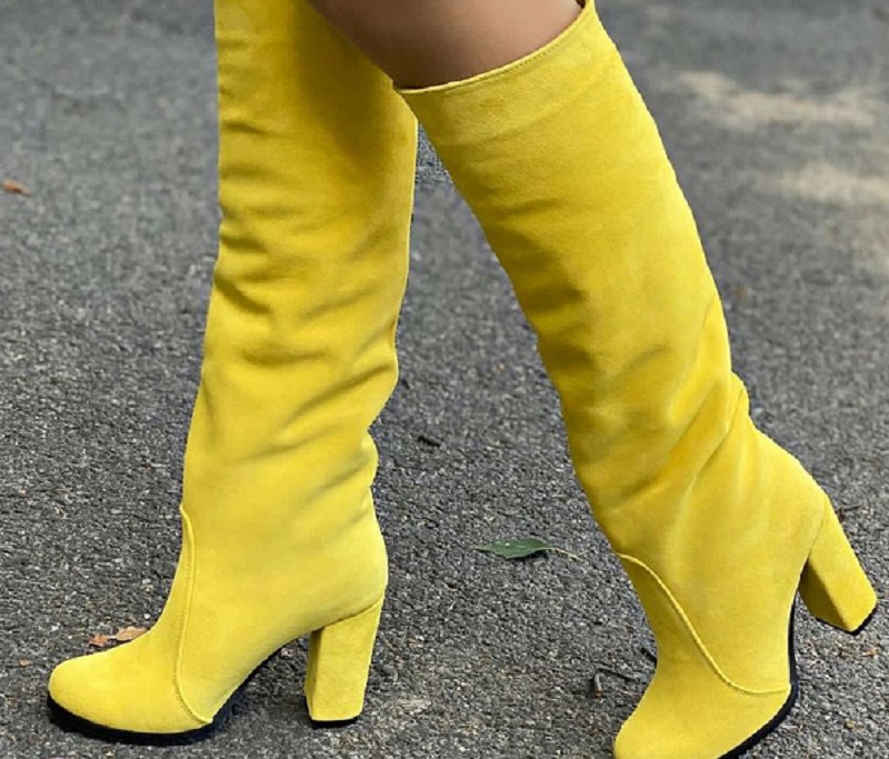 Высокие желтые сапоги подходят к коричневым юбкам и жакетам в стиле 1960-х. Они точно придадут смелости и живости образу.