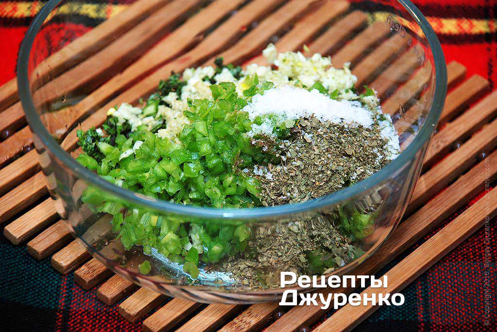 Мякоть кизила мелко рубим ножом практически до состояния пюре. Смешиваем кизиловое пюре с пряной заправкой и добавляем 1 ст. л. оливкового масла.