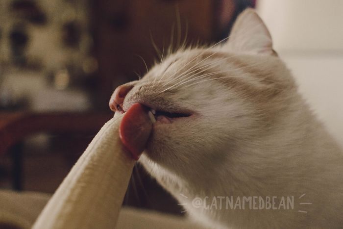 Самое забавное в этой ситуации, что кот предпочитает не есть бананы, а облизывать. Когда рядом с ним оказывается любимый деликатес, Бин тут же теряет связь с реальностью. Однажды его хозяйка стала снимать моменты райского наслаждения, чем прославила кота в соцсетях.
