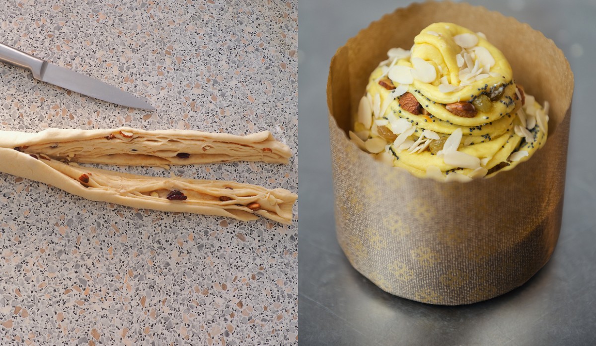 Каждый шар раскатываем в пласт с помощью качалки – чем тоньше, тем лучше. Сверху тесто смазываем размягченным при комнатной температуре сливочным маслом. Выкладываем сухофрукты, которые предварительно нужно замочить в коньяке или роме на сутки, миндальные хлопья и кусочки белого шоколада. Очень аккуратно, чтобы тесто не порвалось, заворачиваем его в рулет. Затем берем острый нож и разрезаем рулет в длину, но не до конца. Скручиваем сначала первую часть, а затем вторую – так, как показано на видео. Выкладываем в форму диаметром 13 см.