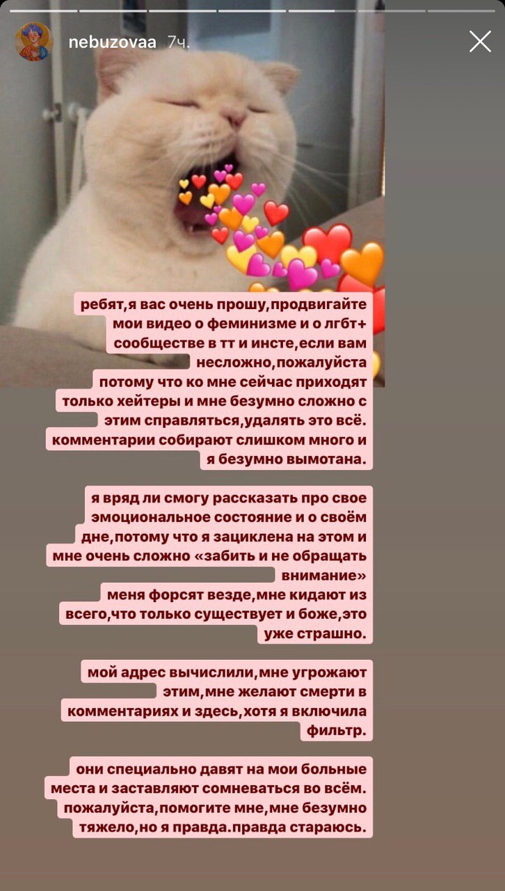 Будь готова успокаивать свою младшую сестру, которая неделю не выходит из дома. Будь готова жить в страхе и терпеть постоянные оскорбления и пожелания смерти. Будь готова слушать токсичные шутки и смешки за спиной от знакомых и прохожих. Будь готова к тому, что "это нормально". Будь готова к тому, что такое отношение поддержит более ста тысяч. Молчи. Живи с этим. Сама виновата.