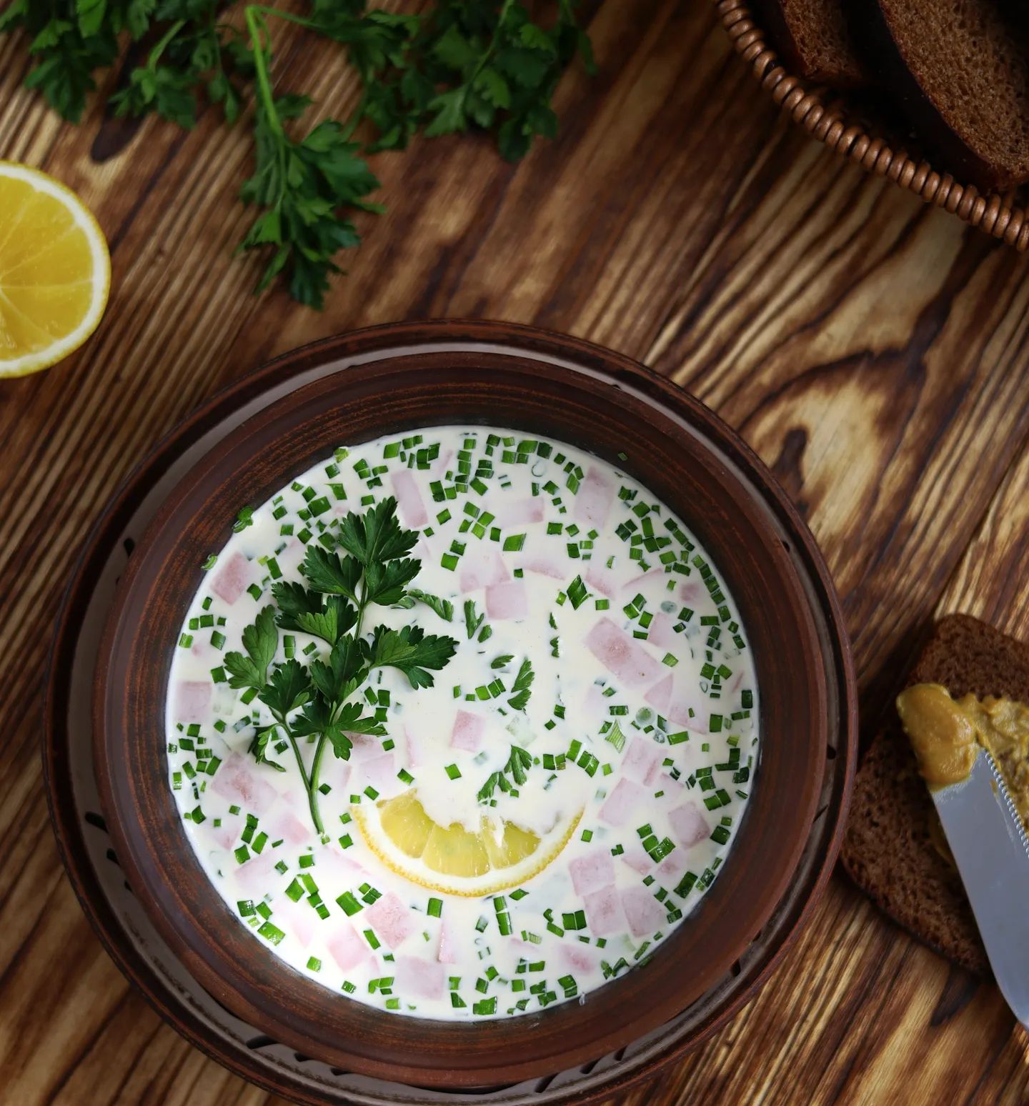 Ингредиенты: копченое куриное филе (300 г), картофель (3 шт.), редис (6 шт.), огурец (3 шт.), яйцо (3 шт.), укроп, зеленый лук, греческий йогурт или "Айран" (500 г), лимон (1 шт.), горчица (1 ч. л.), сметана (3 ст. л.).