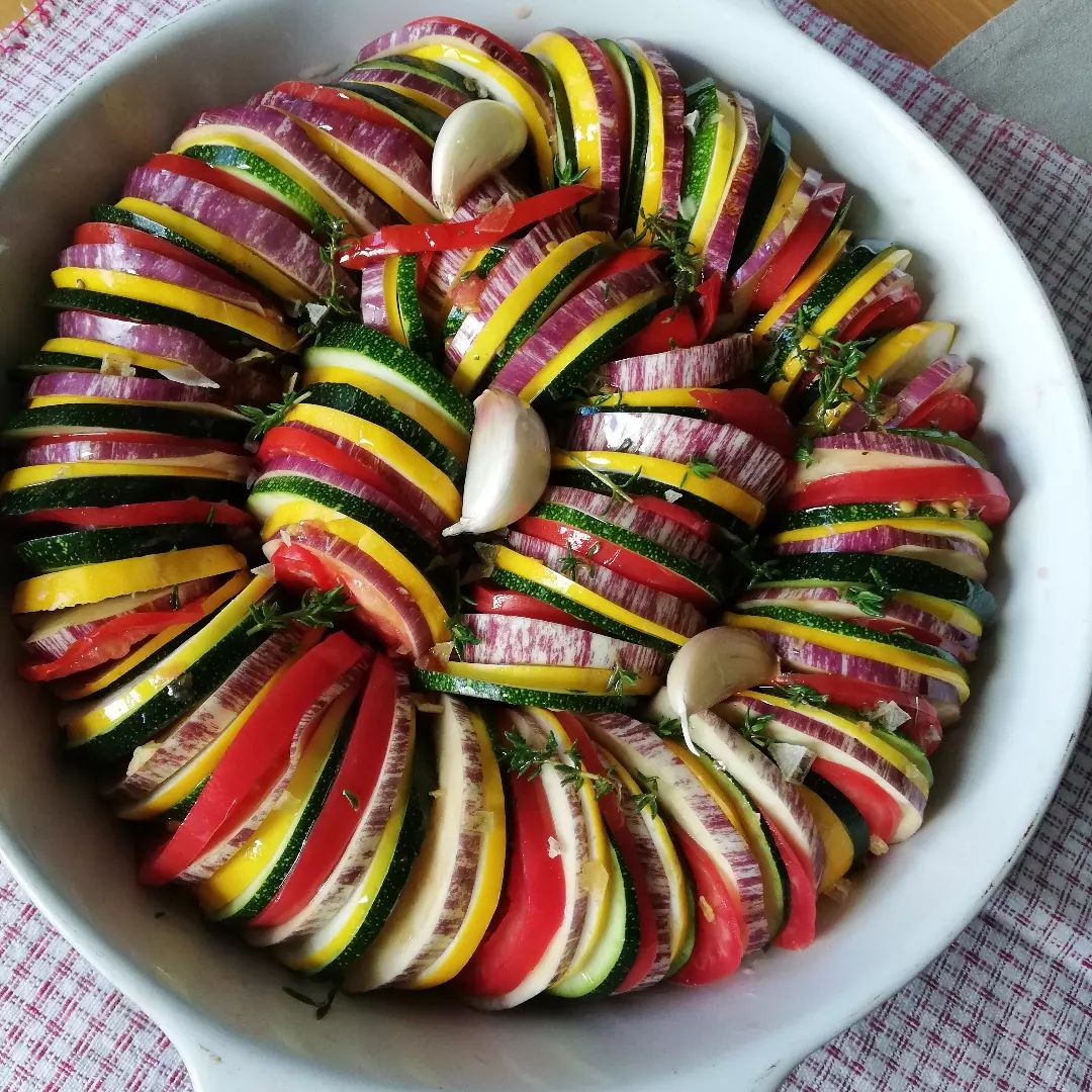 Ингредиенты: красный болгарский перец (2 шт.), баклажан (1 шт.), кабачок (1 шт.), желтый кабачок (1 шт.), лук (2 шт.), помидор (4 шт.), чеснок (4 зубчика), оливковое масло, тимьян (4 веточки), базилик (6 веточек), овощной бульон (150 мл), соль (по вкусу), прованские травы.