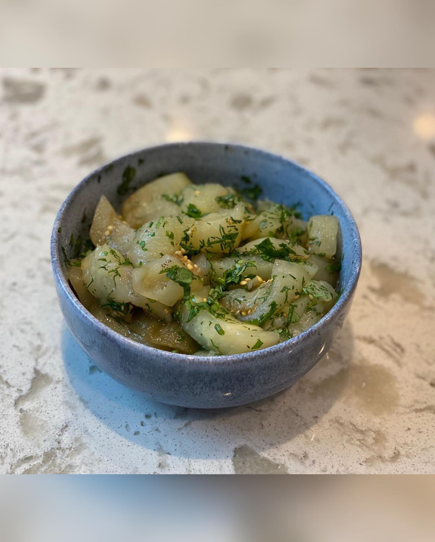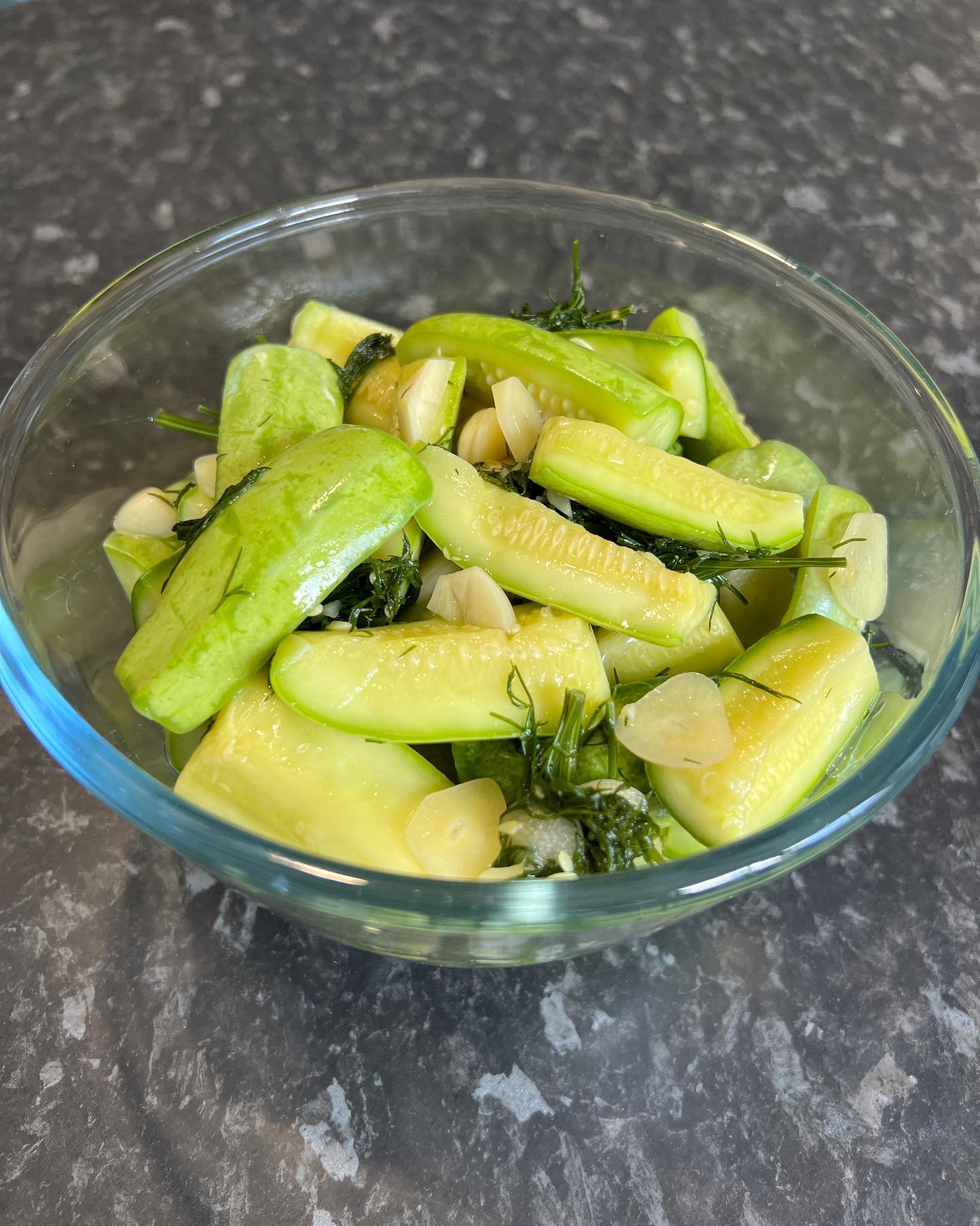 Ингредиенты: кабачки или цуккини (1 кг), соль (1 ст. л.), сахар (1 ч. л.), чеснок (4-5 зубчиков), укроп, лавровый лист, уксус (1 ст. л.).