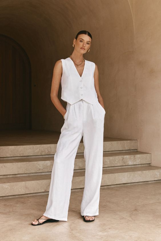 Лен - материал, в котором будет комфортно даже в знойную жару, поэтому девушки часто имеют в гардеробе несколько предметов одежды изо льна. Это может быть топ или жилетка, которая станет модным дополнением льняным брюкам.