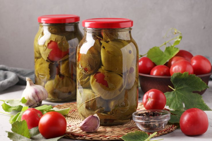 Эта закуска на зиму никого не оставит равнодушными – маринованные помидоры в виноградных листьях очень вкусные и эффектно смотрятся, а специи придают пикантности и аромата.