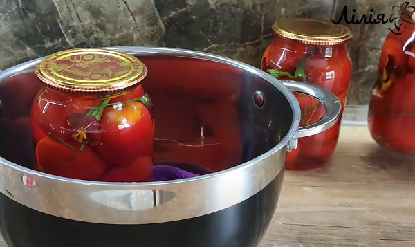 4. Горячим маринадом залейте помидоры, накройте крышками и поставьте банки в кастрюлю с водой для стерилизации.