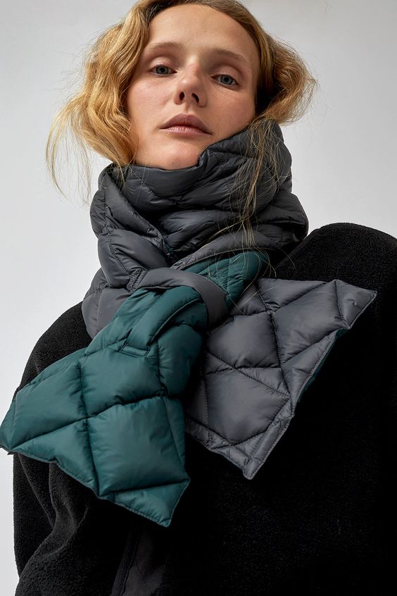 Стеганые шарфы на модном рынке представлены разной длины, фасонов и объема. Также может отличаться материал. Кроме классических моделей из плащевки популярностью также пользуются шарфы из шерпы или комбинированные шарфы.