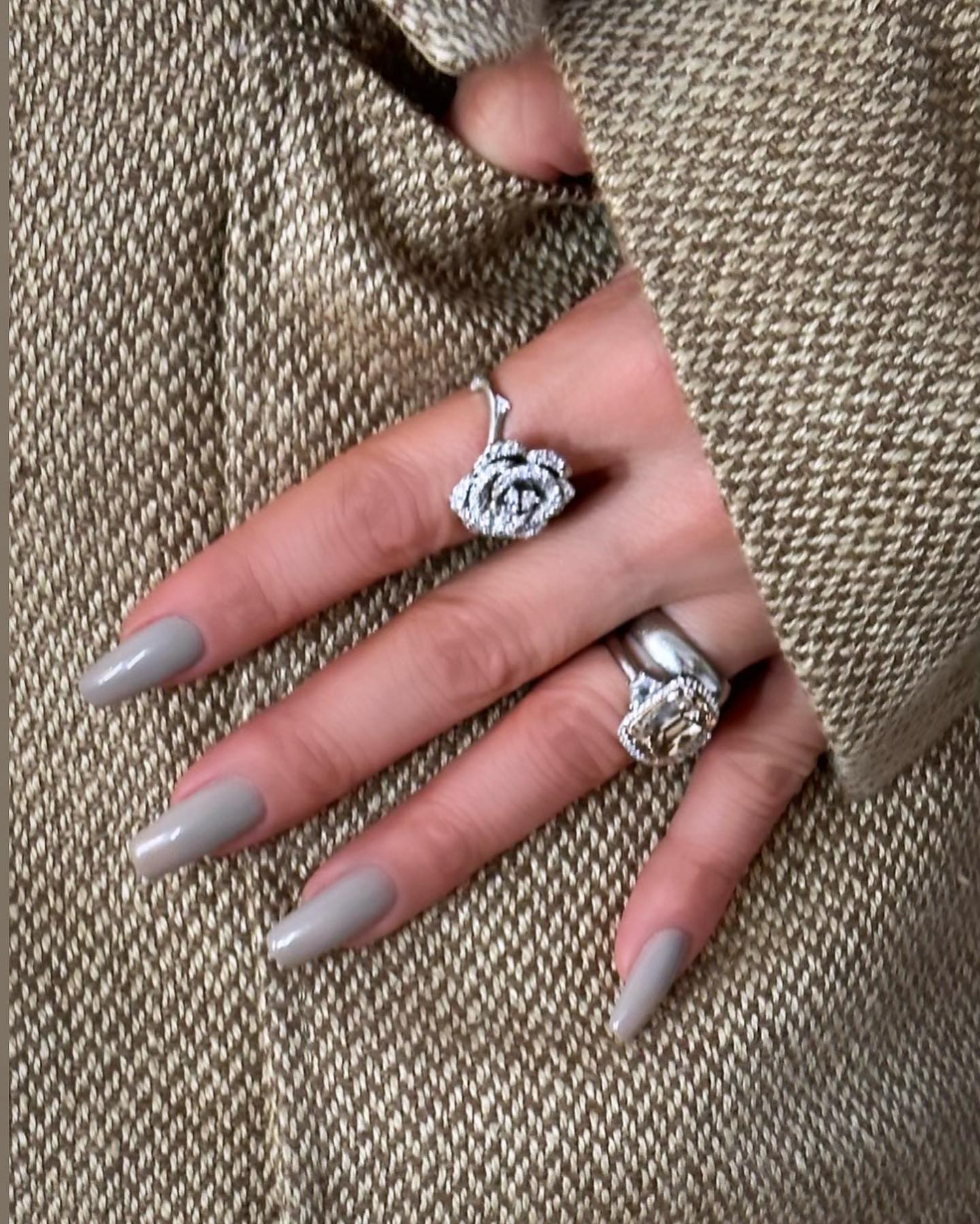 В то время Дженнифер Лопес предпочитает более спокойные и приглушенные тона. Так, знаменитость выбирает приятные серые оттенки, которые идеально подходят для осеннего времени. Покрытие женщина носит на длинные ногти формы мягкий квадрат.