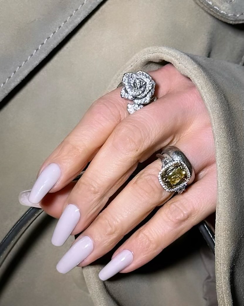 Кроме серого, Лопес также является любительницей более теплых цветов. Серые оттенки она комбинирует с лавандовыми, однако что касается формы и длины ногтей, то их Дженнифер не спешит менять.