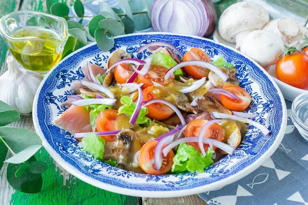 Ингредиенты:слабосоленая семга (100 г), свежие шампиньоны (100 г), красный лук (0,5 шт.), помидоры черри (5 шт.), чеснок (1 зубчик), листья салата (1 пучок), оливковое масло (50 мл), мед (1 ч. л.), острая горчица (1 ч. л.), соль, черный молотый перец.