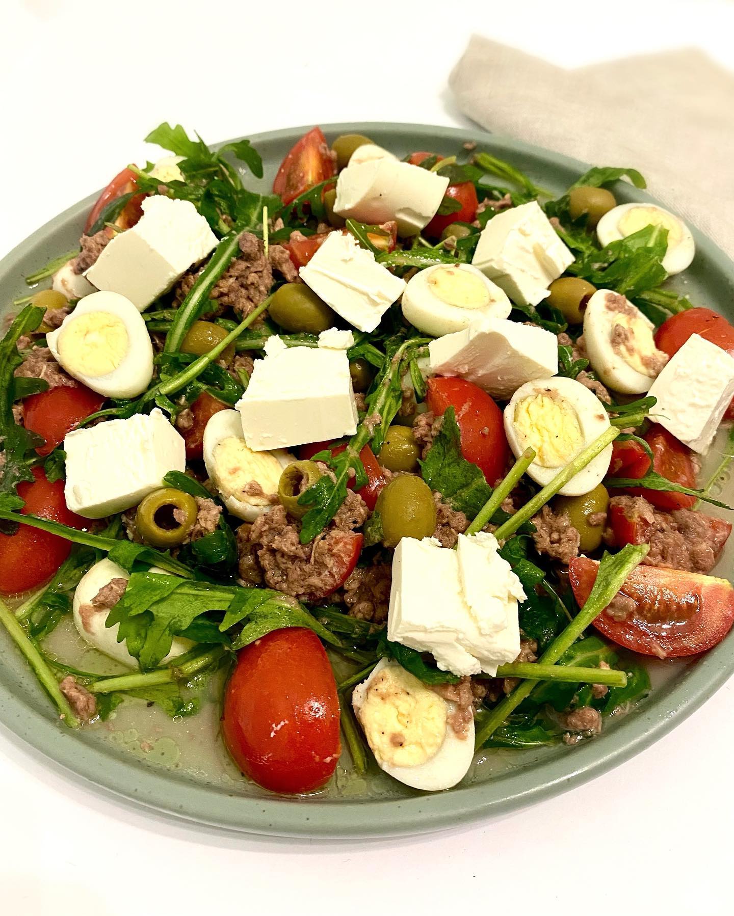 В тарелку выкладываем рукколу, помидор, яйца, оливки, тунец. Перемешиваем, поливаем заправкой. Сверху выкладываем фету.