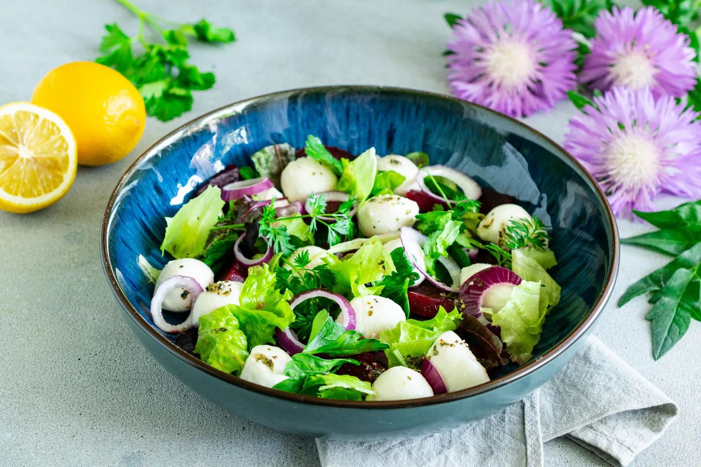 Ингредиенты: свекла (200 г), микс салатов (100 г), мини моцарелла (150 г), красный лук (50 г), лимонный сок (30 мл), оливковое масло (30 мл), сушеные итальянские травы (5 г), соль, черный молотый перец, укроп, петрушка.