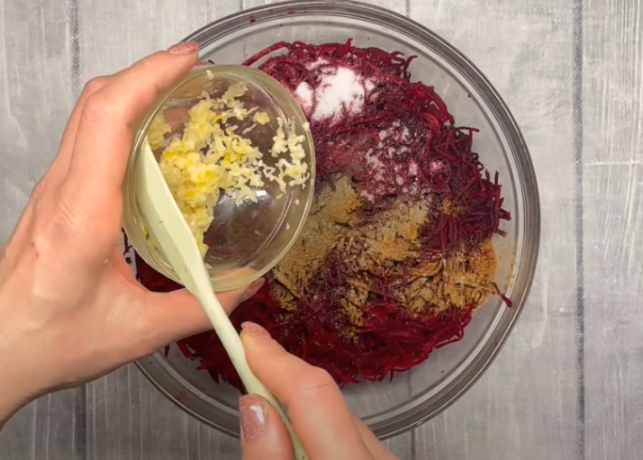 Разогретое на сковороде масло выливаем сверху на чеснок и тщательно все перемешиваем, чтобы специи равномерно распределились по всей свекле.