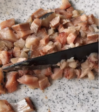 Сельдь чистим от костей и нарезаем филе – ее надо порубить мелко ножом. Считается, что форшмак нужно резать именно ножом (ну, на крайний случай, мясорубка).