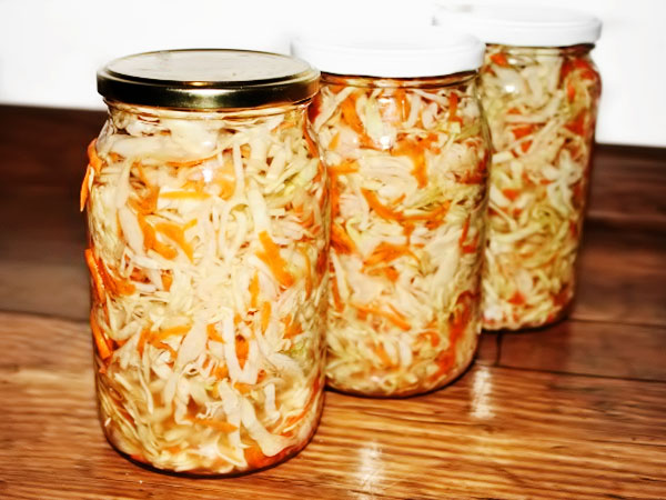 После того, как капуста сквасится, раскладываем ее в стерильные банки и герметично закрываем крышками. Убираем в темное прохладное место до зимы, а в холодное время года открываем баночку и наслаждаемся вкусом.