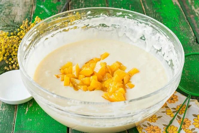 Сливаем сироп из банки консервированных персиков. Режем их небольшими кусочками, добавляем в тесто и еще раз перемешиваем.