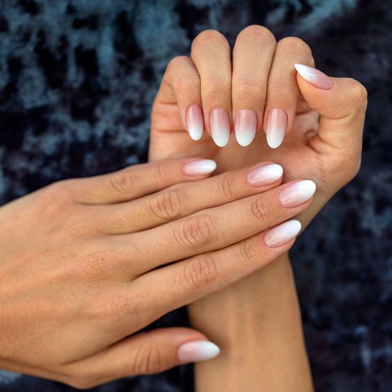 Также можно сделать нежный бело-розовый маникюр с градиентом – то есть переходом одного цвета в другой, границы между которыми "размывают". Этот дизайн еще называют эффектом омбре.