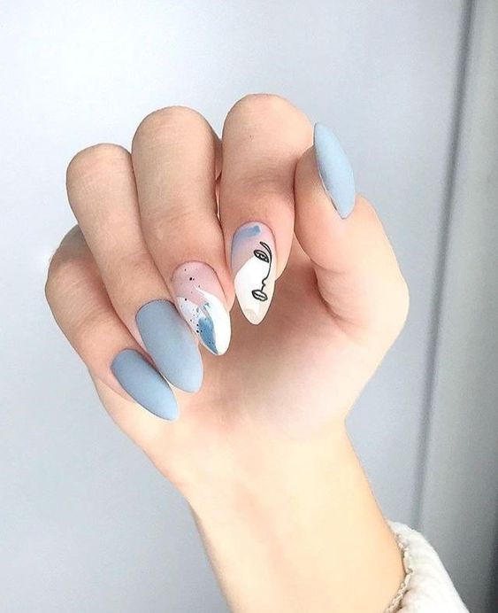 Еще один вариант – с небесно-голубым оттенком. А в качестве дизайна выберите наклейку с изображением силуэта и хаотичные мазки на одном или двух ногтях.