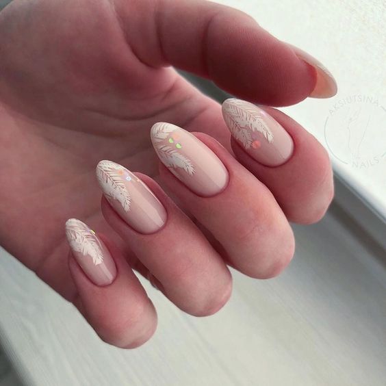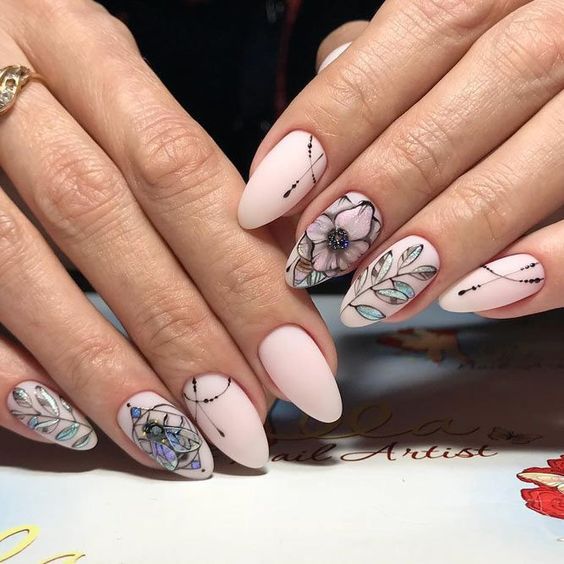 Обладательницы длинных ногтей миндалевидной формы могут выбрать маникюр со множеством рисунков. Для начала покройте ногти нежно-бежевым цветом и матовым топом, потом с помощью стемпинга нанесите очертания рисунков, которые можно потом можно будет раскрасить.