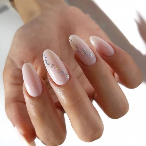 Еще один вариант, как разнообразить однотонный маникюр, - сделать легкие мазки лаком с блестками.