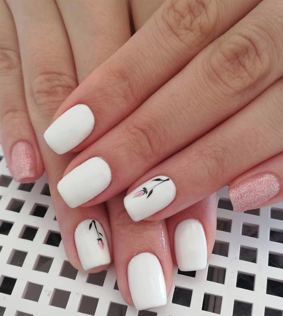 Еще один вариант нежного маникюра на весну: несколько ноготков покройте белым цветом, а один или два – розовым. На одном из белых можно сделать дизайн в виде наклейки с изображением цветка.
