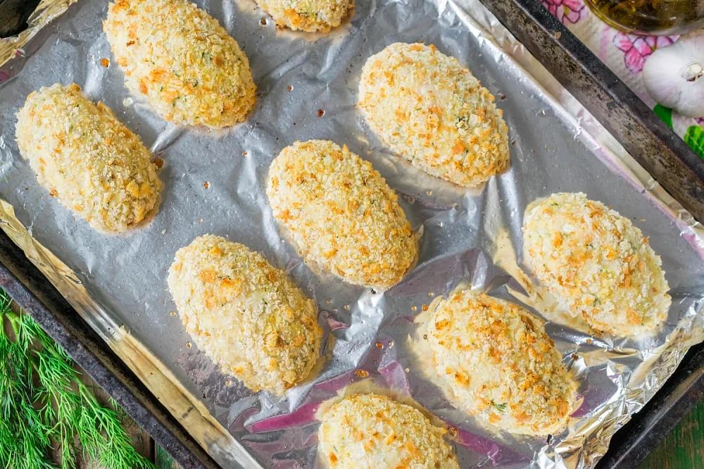 Выкладываем заготовки на противень с фольгой, смазанным маслом. Запекаем куриные котлеты в разогретой до 180 градусов духовке до золотистой корочки 20-25 минут.