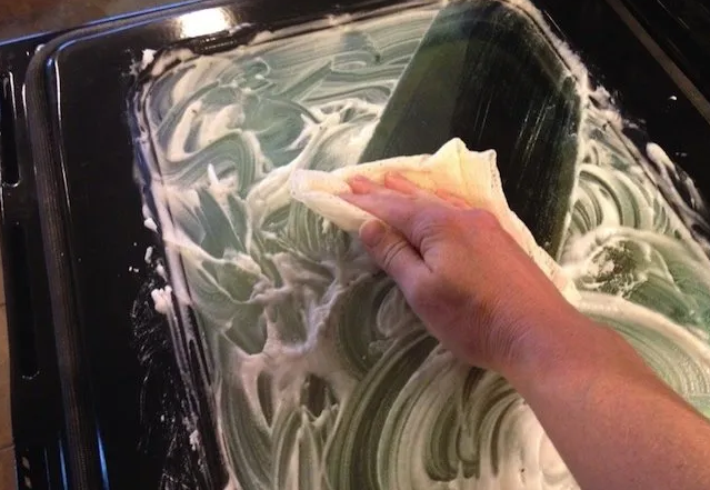 5. Очистите стойкие пятна от жира чистящим стеклом духовки.