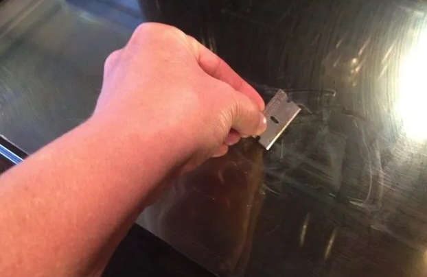 Если после того, как вы нанесли и стерли пасту, еще остался пригорелый жир, воспользуйтесь лезвием бритвы, чтобы аккуратно его соскоблить. Протрите дверцу чистой влажной тканью, чтобы убрать "стружку" из жира.